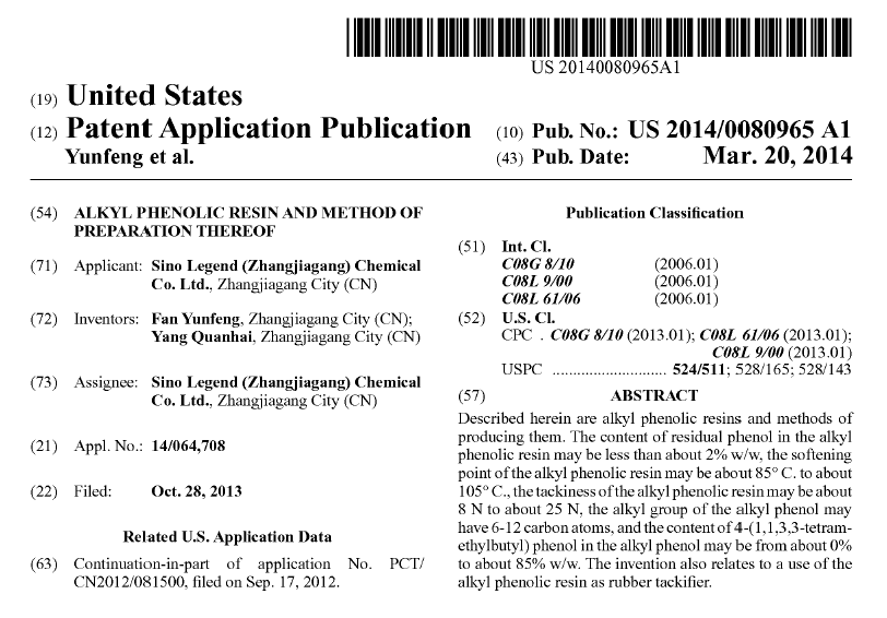 日前,我司于2013年向美国商专局提交的专利申请 “Alkyl Phenolic Resin and Method of Preparation Thereof”喜获授权US20140080965,实现了我司发明专利在境外正式授权的突破。
